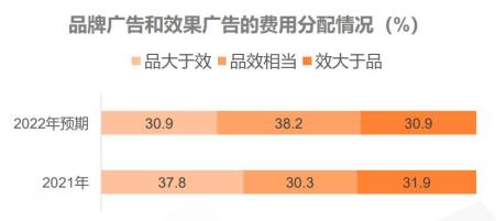 ● 報告顯示,2021年廣告主將52.5%預算用于品牌廣告、47.5%用于效果廣告。而在2022年,廣告主品效預算占比的差額進(jìn)一步收窄,分配預期更加均衡。