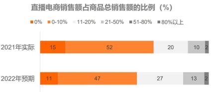 ● 報告顯示,2021年半數廣告主表示,直播電商渠道的商品銷(xiāo)售額占總銷(xiāo)售額的比例在0-10%的區間,多數廣告主預期2022年會(huì )有所上漲。