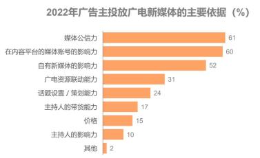 ● 六成以上的廣告主2022年已經(jīng)或者將會(huì )在廣電新媒體上投放。媒體公信力是廣告主投放廣電新媒體的首要依據,這表明媒體權威性和價(jià)值觀(guān)能夠在數字和非數字媒體貫通,也是廣電新媒體的獨特優(yōu)勢所在。